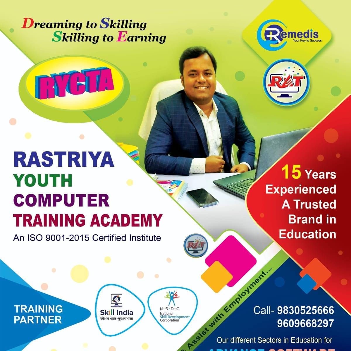 RYCTA provides high quality & high Standard computer education at a very low cost. RYCTA's mission is to create a pool of high quality Skill Based IT Professionals who will meet the demanding needs of multinational organizations for tomorrow’s challenges. Training methods have been maximized with “learning” rather than “teaching” through well equipped lab ONE-TO-ONE ratio (ONE COMPUTER FOR ONE STUDENT). With structured combination of full audio & video theoretical and practical sessions, reinforced with LED Projector in every class room for live demonstrations. Education in India has made path-breaking progress over the last one and a half decade. Indian Government also gives the slogan “Information Technology for all”. For development and extension of this programme 22 Lac Information Technology Experts requires within next five to six years.Other than IT Field BPO,Banking ,Factory& Industries requiresemployee more than 10 Lac .